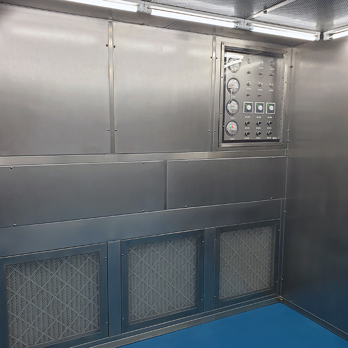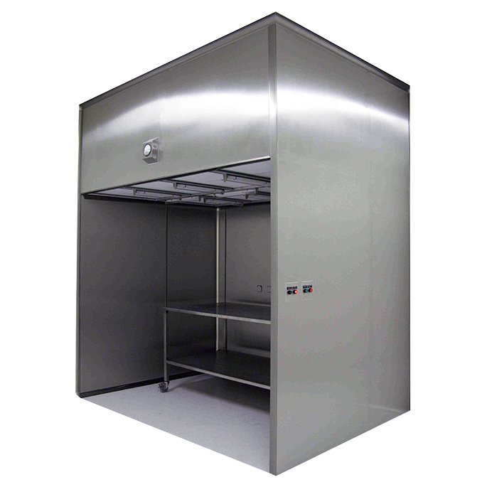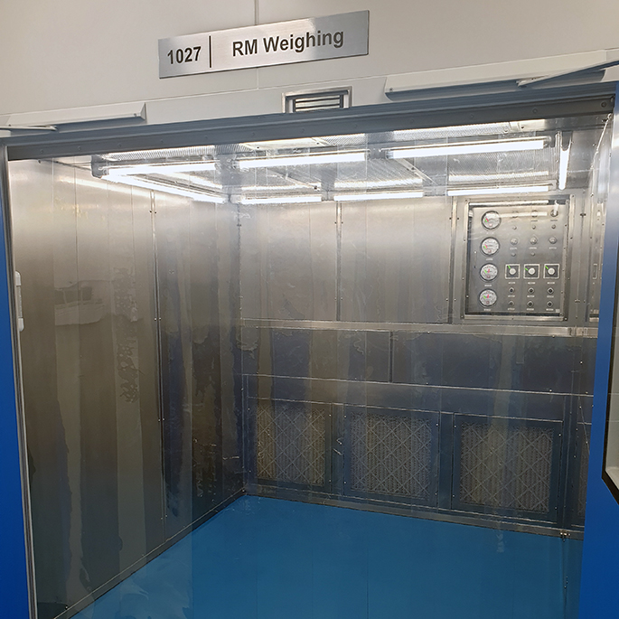 Weighing Booth: ห้อง (ตู้) ที่ออกแบบเพื่อใช้สุ่มตรวจตัวอย่าง (raw sampling) การชั่งและจ่าย (dispensing) ยา วัตถุดิบ (raw material) และสารเคมีต่างๆ เพื่อลดโอกาสเกิดการปนเปื้อนข้าม (cross contamination) ระหว่างผลิตภัณฑ์ และบริเวณพื้นที่ปฏิบัติงาน ระบบการกรองประกอบด้วย Prefilter, Medium Filter และ Final Filter (HEPA Filter) โดยมีลักษณะแรงดันภายในเป็น Negative Pressure