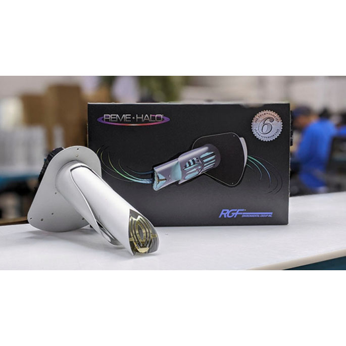 The REME-HALO® utilizes RGF’s patented REME® Cell technology with UV-C light to create low level, airborne hydrogen peroxide throughout the air-conditioned space reducing airborne and surface bacteria, viruses, odors, and mold.